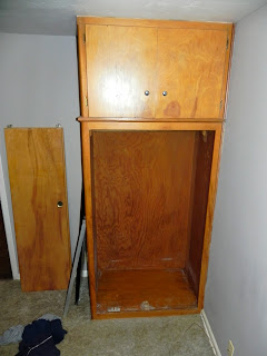 This past Saturday we completed our first major demolition/home project!!! There really is not a whole lot that we need to change about this house, but the "closet" in the master bedroom has been on the books since day one. Our bedroom is off the kitchen (as you'll be able to see in later pics), and it had been previously used as an office (a very large one!) so the lack of closet space had not been an issue. In fact, the nasty thing you see below had probably not been in use these past 10 years, judging by the 3 inch layer of dust inside it! There was one hanging rod and two sliding doors (already removed in this pic, but sitting beside it), awkward to say the least.